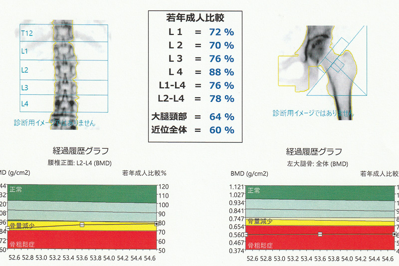 DEXA法による骨密度の測定 骨粗しょう症の診断に重要な検査です。加齢による経時的な変化を考慮しつつ、治療薬の効果を判定します。